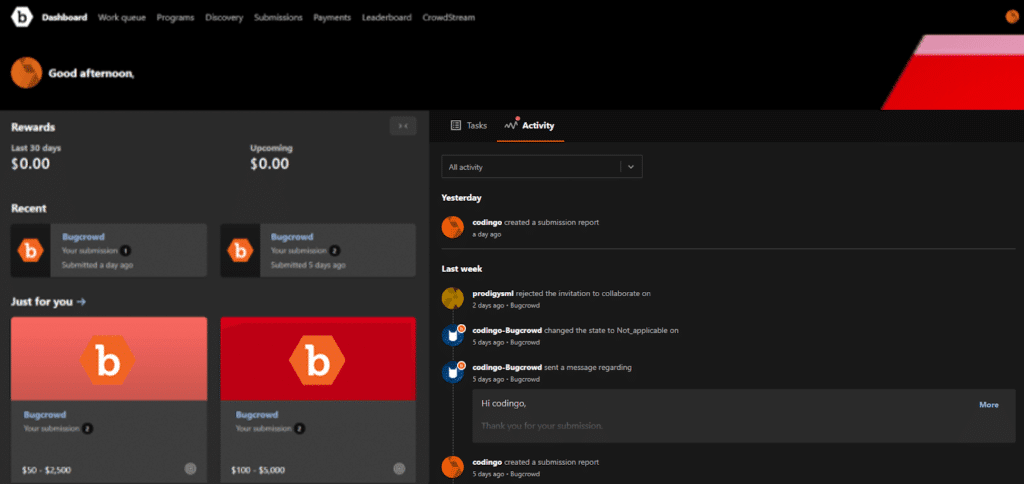 We understand that each of our researchers are unique and have different needs when it comes to working on the platform. As always, our primary directive is to make the Bugcrowd platform the home for hackers and security researchers. Taking in your feedback, our team has redesigned the dashboard with features you’ve been requesting such as program recommendations, current tasks on submissions, rewards, and activity on recent programs!
