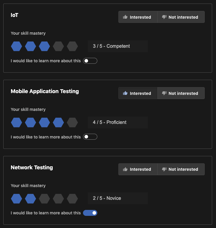 To set your skills and interests, head over to your Profile section → Skills and Interests. Once here, you’ll find a total of 17 different skills to self-assess, ranging from Automotive to Cryptography to Static Code Analysis. You can rate yourself on a scale of 1-5 (with 5 being the highest) for your competency in each skill. If you are interested (or not interested) in a specific skill, use the Thumbs Up / Thumbs Down buttons to let us know.