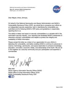 Shortly after identifying and safely disclosing the vulnerability to the NASA VDP program, I was rewarded a recognition letter from NASA showing their appreciation.