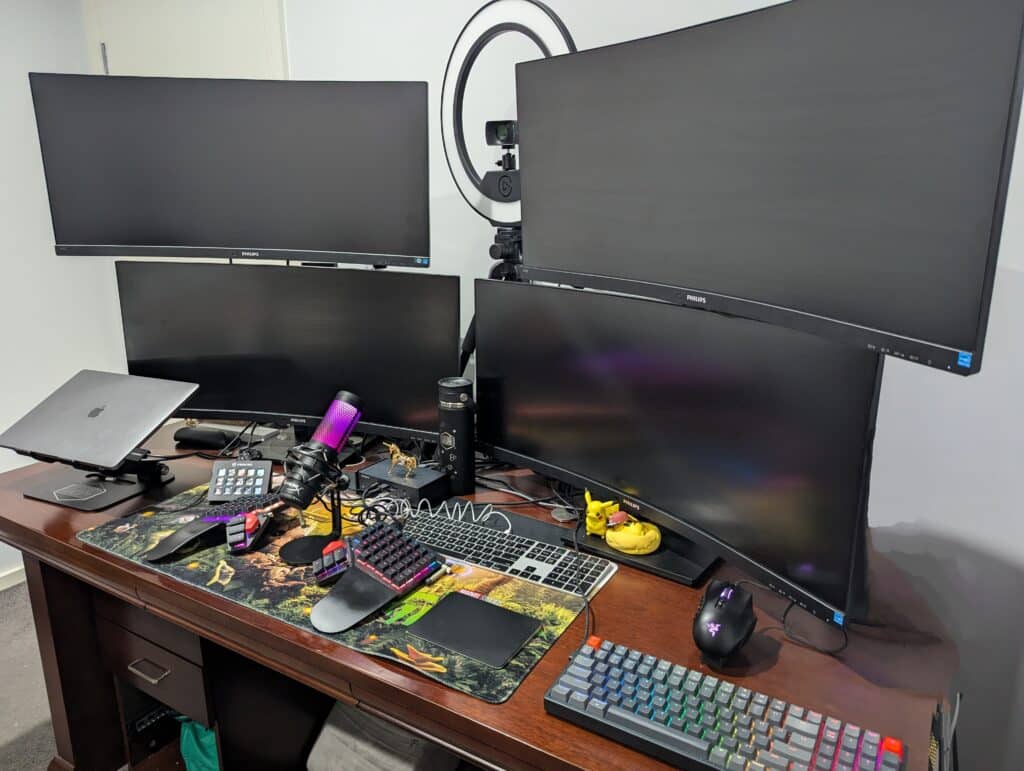 Saj Lohani, Senior Directory of Cybersecurity at Bugcrowd, doesn’t mess around when it comes to the number of monitors in his battlestation!