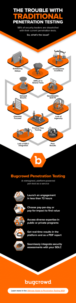 You can download the report here. In the meantime, this infographic provides a sneak peak to the report. It highlights 10 major challenges with traditional penetration testing and how Bugcrowd does it differently.